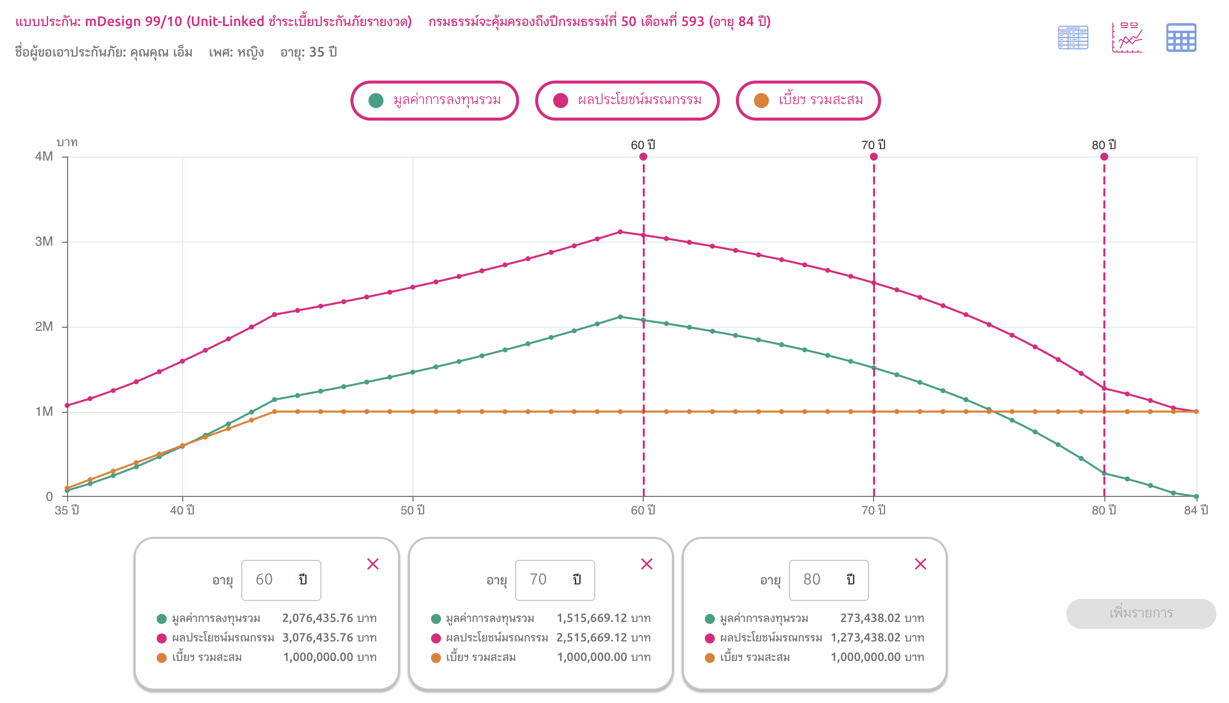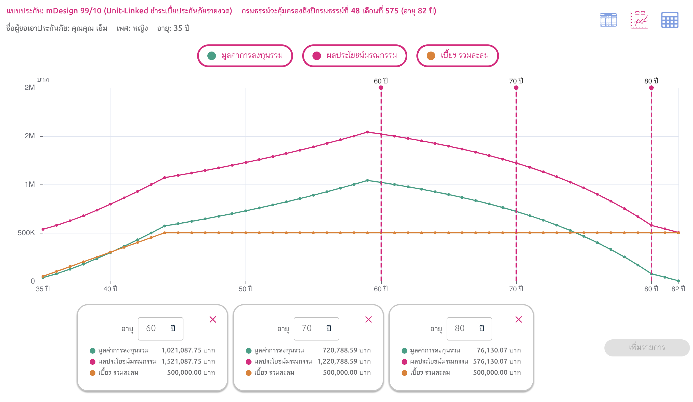 - เมื่ออายุ 60 จะมีมูลค่าการลงทุน 2,076,435 บาท คุ้มครองเสียชีวิต 3,076,435 บาท ถอนเงินจากมูลค่าการลงทุนมาใช้เป็นบำนาญปีละ 120,000 บาท