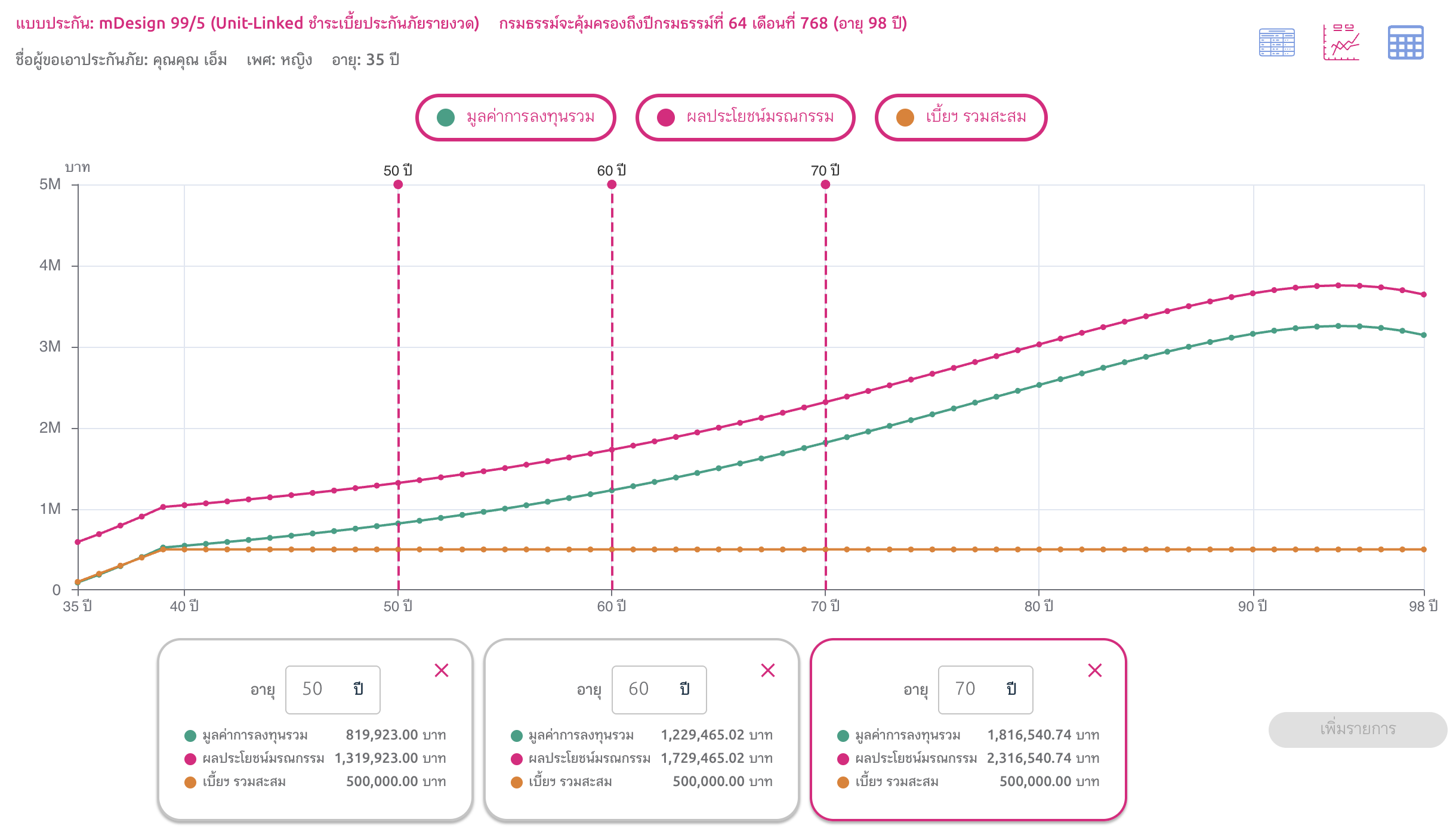 - เมื่ออายุ 60 จะมีมูลค่าการลงทุน 1,229,465 บาท คุ้มครองเสียชีวิต 1,729,465 บาท