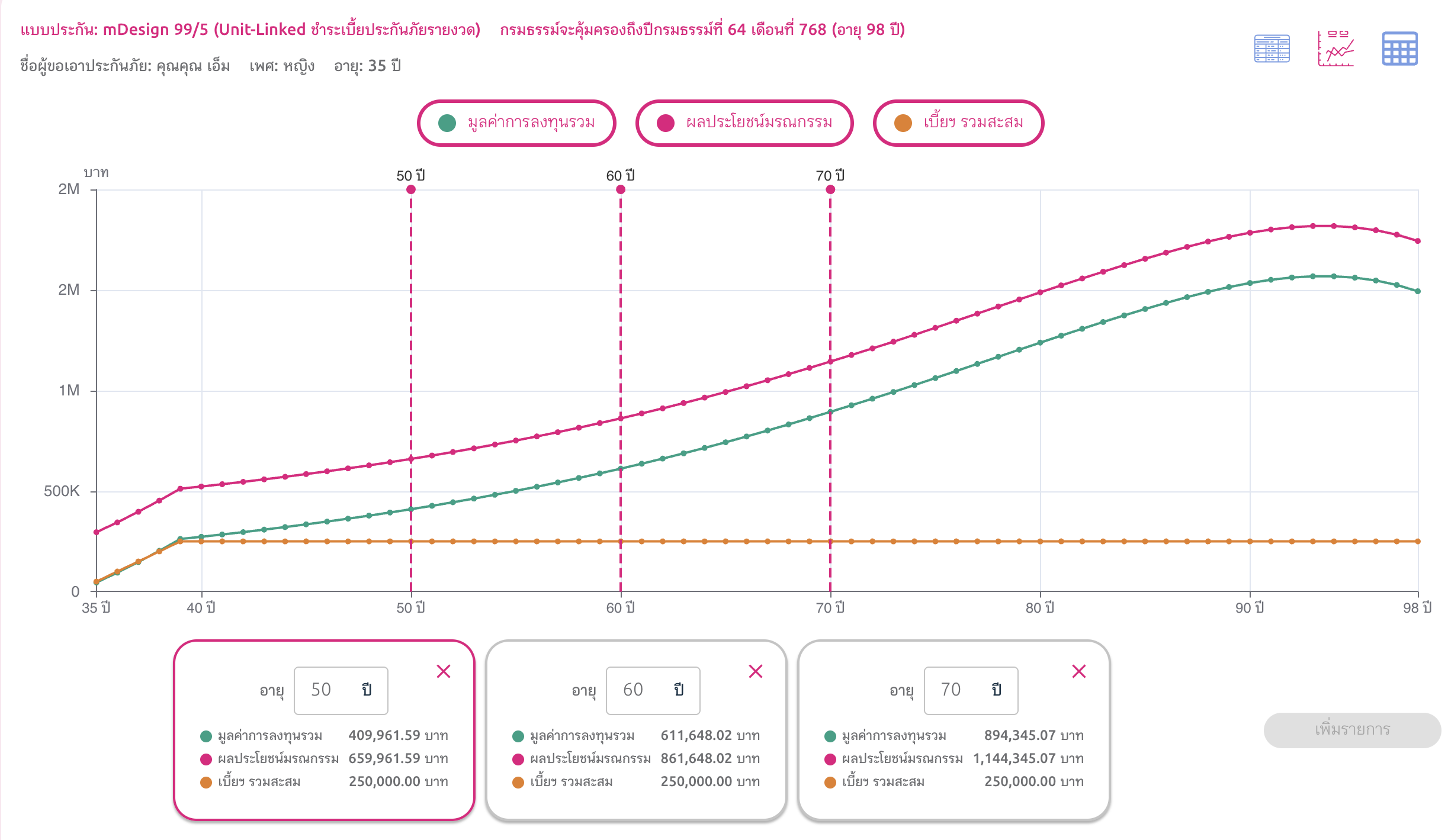 - เมื่ออายุ 70 จะมีมูลค่าการลงทุน 894,345 บาท คุ้มครองเสียชีวิต 1,144,345 บาท